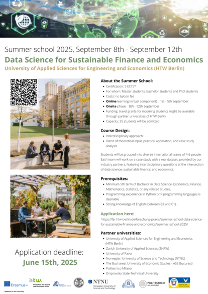 The Summer School is targeted to bachelor, master or PhD students who are interested in application of quantitative tools to tackle problems of green energy, decarbonised economy and sustainable finance. This summer school is an intense program where students will dive into the quickly changing subjects of data science, sustainable finance, and economics. Students will boost their existing skills and learn new ones by working on a shared project. Supporting lectures and teaching materials for self-study will overview state-of-the-art ideas about the connections between data science, sustainable finance. The program will finish with a hands-on project, provided by our business partners.